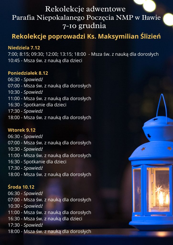 1. Dzisiaj na wszystkich Mszach św. rozpoczynamy rekolekcje adwentowe dla dorosłych i dla dzieci. W tym roku poprowadzi je ks. Maksymilian Ślizień – doktorant prawa kanonicznego z Warszawy. Msze św. z naukami rekolekcyjnymi dla dorosłych oprócz niedzieli: w poniedziałek, wtorek i środę o godzinie 7.00, 11.00, 18.00. Spowiedź święta 20 minut przed poranną Msza św. o godz. 7.00; pół godziny przed Mszami o godzinie 11.00 i 18.00. Dla dzieci oprócz niedzieli nauki rekolekcyjne: w poniedziałek i wtorek o godzinie 16.30, natomiast w środę o godz. 16.30 będzie Msza św. z nauką rekolekcyjną. Spowiedź święta dla dzieci każdego dnia rekolekcji o godzinie 16.30. Nie odkładajmy spowiedzi na ostatnią chwilę. Szczegółowy plan rekolekcji zostanie zamieszczony w biuletynie, na stronie internetowej parafii oraz w gablocie przed kościołem.